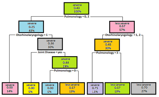 In the next step of tree generation, the dependency of disease severity on such parameters as mutation severity, disease seriousness (severe infections), the number of less severe diseases transmitted, the occurrence of similar cases in the family history and the age of the onset of first signs and symptoms, was analyzed. The model obtained the best results using such parameters as Minsplit—5, Maxdepth—5.