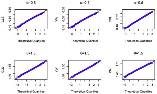 First, we give the Q–Q plots of the CLS, YW, and CML estimates for the BL-INAR(1) model with sample size , , and in Figure 1. From the six Q–Q plots, we can see that they contain roughly straight lines; i.e., the estimates of the parameters are normally distributed. Then, the numerical simulation results are presented in Table 1 and Table 2. By comparing the two tables, we can find that with the same and T, the mean squared error (MSE) for the estimate of increased with the increase of , but the MSE for the estimate of decreased. Additionally, the MSE for the estimate of increased with the increase of with the same and T, but the MSE for the estimate of decreased. Furthermore, we can observe that the estimates of CLS and YW are similar, and the bias tended toward zero for all estimates as the sample size increased. The estimates of CML converged faster to the true parameter values. We conclude that the CML estimates produced the smallest mean square errors, and CML performed better than CLS and YW.