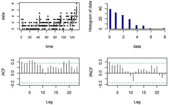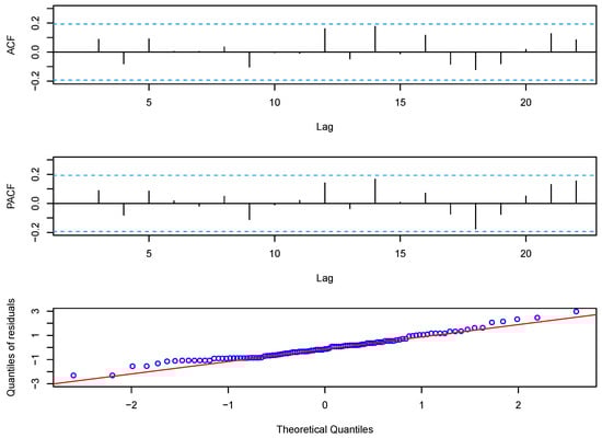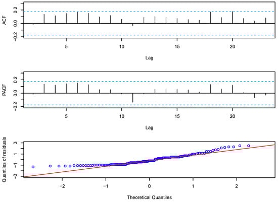 The sample mean, variance, and dispersion index were calculated to be , , and , respectively. According to the overdispersion test, the critical value of the data is , and we observe that it was inappropriate to use the P-INAR(1) model to fit the data. The CML estimates, AIC, BIC, CAIC, HQIC, fitted mean, and fitted variance for the BL-INAR(1), P-INAR(1), G-INAR(1), PL-INAR(1), NB-INAR(1), ZIP-INAR(1), DP-INAR(1), and GP-INAR(1) models were obtained and are shown in Table 4. We see that the AIC, BIC, CAIC, and HQIC of the BL-INAR(1) model are smaller than those of others, and the fitted mean of the BL-INAR(1) model is not much different from those of the other seven models. Further, we can see that the BL-INAR(1) model performed better than others when calculating the fitted variance. Similarly to the previous example, the first 102 observations were used to estimate the parameters and predict the last six observations. The RMSE of the predictions is also presented in Table 4. We can observe that the RMSE of the G-INAR(1) model is the smallest; however, it is only 0.05 less than the RMSE of the BL-INAR(1) model. As in the previous example, although the BL-INAR(1) model was not the best under the fitted mean and RMSE criteria, it performed best under the other five criteria. Additionally, we show the Pearson residuals analysis. Figure 5 gives the ACF, PACF, and Q–Q plots of the residuals. We found that there is no evidence of any significant correlation within the residuals, a finding also supported by the Ljung–Box test with a p-value of 0.9522, which is greater than 0.05. The Q–Q plot also appears to be roughly normally distributed. Thus, according to above discussions and its simplicity, we can conclude that the BL-INAR(1) model was the most appropriate.