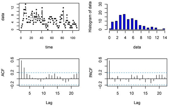 The second dataset, which was analyzed by Weiß (2010) [], is the monthly number of work stoppages (strikes and lock-outs) of 1000 or more workers for the period 1994–2002. It was published by the US Bureau of Labor Statistics and can be obtained by online at the address Available online: http://www.bls.gov/wsp/ (accessed on 8 May 2012). The data contain 108 observations, and the time plot, histogram, ACF, and PACF are provided in Figure 4. As with the previous example, the Ljung–Box test was used to check whether the strike data have any autocorrelation. The p-value of the Ljung–Box test was , which shows that the time series data have some autocorrelation, and according to the PACF diagram, it is also first-order autocorrelated, so an AR(1)-type process is appropriate for modeling this dataset.