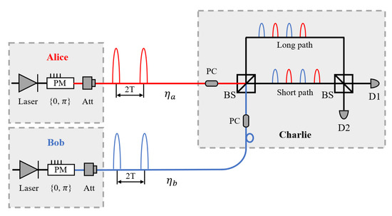 Preparation: Alice (Bob) prepares a weak coherent pulse train and phase-modulates each pulse randomly by 0 or . The coherent states can be denoted as . Then, she (he) sends out the coherent state pulse whose period is 2T to Charlie with an average photon number less than one per pulse. Alice (Bob) records her (his) logic bits of each time slot as “0” (“1”) when her (his) modulated phase is 0 . We denote the sequence of detection events time slots as n, where N is the total number of pulses sent by Alice (Bob). The phase shift is the phase induced by the phase modulator on pulse n ignoring the global phase, and intensities , are corresponding to Alice and Bob, respectively.