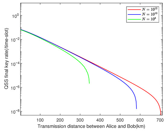 Considering the finite-key effects, let be the observed number of bits, where N is the number of optical pulses sent by Alice and Bob. By using the random sampling without replacement [47], one can calculate the upper bound of hypothetically observed error rate associated with with a failure probability :