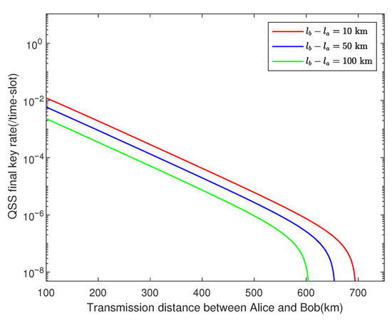 When the original TF-DPSQSS [29] protocol is applied to the asymmetric channels, a high system error rate will arise since different channel transmittances will lead to the poor performance of interference at the beam splitter. Figure 5 presents numerical results of our asymmetric protocols and the original TF-DPSQSS [29] protocol with the difference in length between two channels fixed at 10 km and 14 km. We can see clearly from Figure 5 that our asymmetric protocol improves the secret key rate by two orders of magnitude when km. Moreover, no keys are obtained with difference fixed at 50, 100 km in the original protocol, whereas Figure 4 shows that our protocol still provides a high key rate when the difference is large. It means that in the asymmetric channels, the performance of the asymmetric protocol is much better than that of the original protocol, especially when channels are extremely asymmetric.