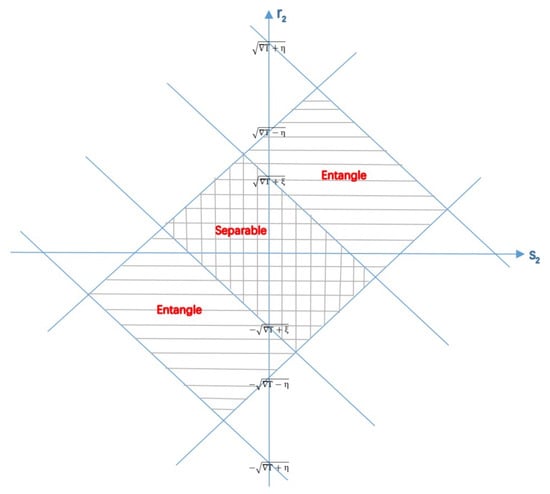 Applying local unitary operators defined in Equation (40) on state , the geometric parameters of the derived state are , and . The condition and is equivalent to and . As local unitary operations do not affect separability, the separability of states and are same. Thus, and is a sufficient condition that is a separable state. As is a general state, we can also say that is separable if and . Similarly, it is trivial to show that the state is separable if and .