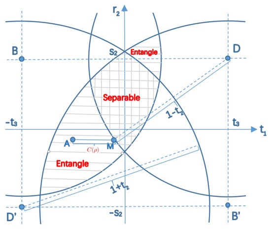Suppose is a two-qubit state as geometrically depicted in Figure 2 without loss of generality. The state ρ is entangled if and only if the free point A is only in the circle D or . The concurrence of state ρ is where M is the intersection of point A’s projection onto the vertical axis and the other circle which A is not in.