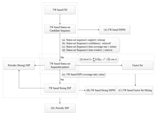 In this paper, the problem of mining sequential patterns of status sets with time windows was proposed by considering the case of time windows. Firstly, the concepts involved in SSPMTW process were defined, and the corresponding properties were proposed, including some new constraints, such as minimum time window, minimum time coverage and minimum periodic time coverage. The periodicity of SSPMTWs was analyzed, and the constraints of cycle width and interval are proposed. According to the research content, this paper proposes the TW-Apriori algorithm and explains the idea of the algorithm. Finally, through small-scale and large-scale examples, the feasibility, effectiveness and efficiency of the proposed method and algorithm were verified, and a variety of patterns and rules were finally mined, such as FSITW, SSPTW, strong SSPTW, factor set of FSITW and periodic SSP; these rules can make the system more orderly and reduce the entropy of the system. Through the comparative analysis of SSPM and SSPMTW, it can be seen that compared with SSPM, SSPMTW can excavate the laws existing in the local time window and analyze the periodicity of the laws, which solves the problem of SSPM ignoring the laws existing in the local time window. In addition, by increasing the confidence threshold, coverage threshold and factor set ratio, we discovered more regular and valuable sequential patterns in the local time window, which overcomes the limitations of traditional sequential pattern mining methods.