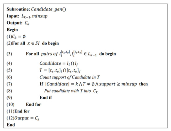 R. Agrawal and R. Srikant [23] proposed an algorithm based on the Apriori feature, which considers that all non-empty subsequences of the sequence pattern are sequence patterns. Based on this property, some Apriori-like algorithms have been proposed successively, which mainly contain two mining ideas: (1) horizontal data format mining ideas: the AprioiAll, AprioriSome, and DynamicSome algorithms proposed by R. Srikant and R. Agrawal [24] and the GSP algorithm proposed by F. Masseglia et al. [25]; (2) vertical data format mining ideas, such as the classical SPADE algorithm proposed by M. Zaki [26] and the SPAM algorithm proposed by Ayres et al. [27].