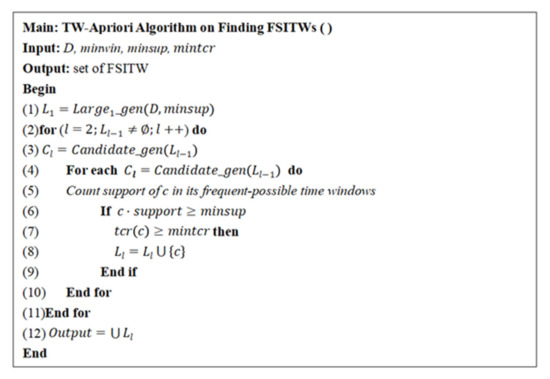 Sequential pattern mining with time windows is rarely studied, but association rule mining with time windows has been studied by some researchers. Xiao et al. [1] studied association rule mining with time windows in real transaction databases and proposed a TW-Apriori algorithm for frequent itemset mining with time windows. Xiao et al. [2] proposed a variable neighborhood search algorithm (VNS) for mining frequent itemsets with maximum time windows. Xiao et al. [3] proposed the VNS algorithm to optimize the maximum frequent time window selection problem in the sequence database of association rules. Zabihi et al. [4] proposed a novel fuzzy sequential pattern algorithm with a sliding window constraint which permits elements of a pattern to span a set of transactions within a user-specified window. Therefore, loss of useful sequences is prevented in the search process.