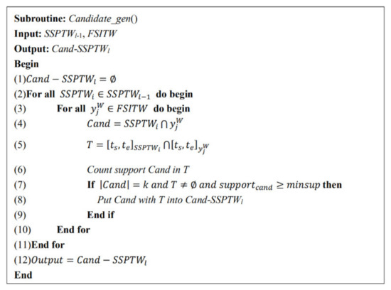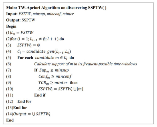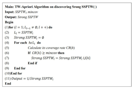 Based on the above definition, it is known that an SSPTW’s average support is always not less than the minimum support, and its average confidence is not less than the minimum confidence; otherwise, a sequence with large average support and average confidence cannot ensure that it is an SSPTW.