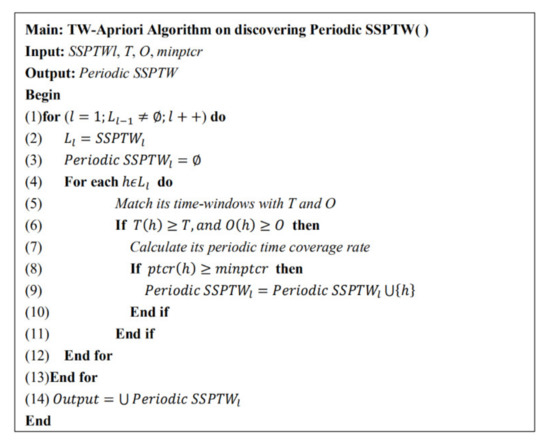 Among them,is the user-defined minimum periodic time coverage threshold. When a periodic patternsatisfies bothandconstraint thresholds, but, this is a periodic SSP with weak periodic time coverage rules.