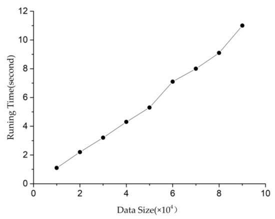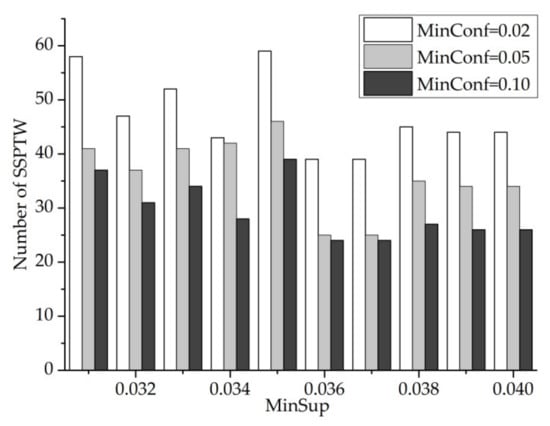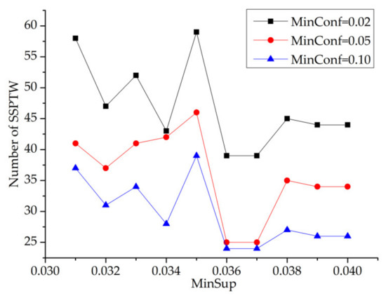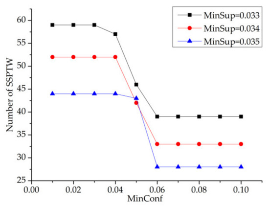 In Figure 13, minsup has three values, which are 0.033, 0.034 and 0.035, respectively. It can be seen from Figure 13 that with the increase in the minsup threshold, the number of SSPTWs finally mined gradually decreases. Moreover, when the minsup threshold is constant, the number of SSPTWs decreases with the increase in minconf value, but the number of SSPTWs does not change in [0.01,0.4] and [0.06,0.1], which indicates that the confidence has little effect on the number of SSPTWs when it is taken in these two intervals. Finally, this paper selects the representative points of minconf value, which are 0.02, 0.05 and 0.10.
