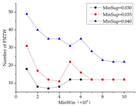 In Figure 14 and Figure 15, the values of minconf are 0.02, 0.05 and 0.10, respectively (minwin = 5000 and mintcr = 0.1). From these two figures, we can see that when minsup is constant, the number of SSPTWs decreases with the increase in minconf. However, when minconf is constant, the number of SSPTWs fluctuates greatly. It can be seen from the figure that when minsup = 0.035, the number of SSPTWs finally mined by the three curves is the largest. Therefore, when minsup = 0.035, the number of SSPTWs is greater.
