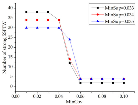 It can be seen from Figure 16 that, when minsup is constant, the number of strong SSPTWs finally mined decreases with the increase in the mincov value, but when mincov is in the interval of [0.01,0.4] and [0.06,0.1], the number curve of strong SSPTWs is a horizontal straight line, which indicates that the change in the mincov value in the interval of [0.01,0.04] and [0.06,0.1] has no effect on the number of strong SSPTWs.