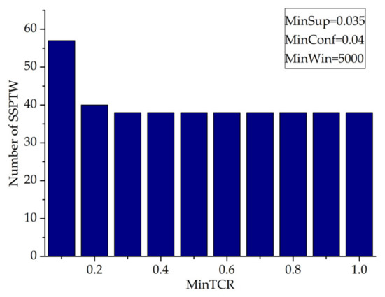 This paper studies the value of mintcr and observes the influence of its value on the number of SSPTWs (minwin = 5000, minsup = 0.035, minconf = 0.04).