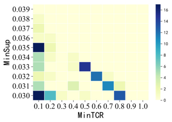 In Figure 18, we can see the number of SSPTWs in all combinations of mincov–minsup intuitively. In addition, according to the different colors and the depth of colors in the graph, the optimal combination of mincov–minsup is obtained, which is divided into (0.1,0.03) and (0.1,0.035).