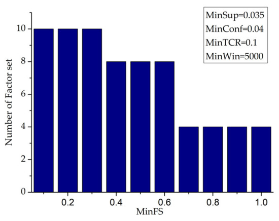 From Figure 19, it can be seen that with the increase in the minfs value, the number of factor sets eventually mined will gradually decrease, and when the minfs value is in three intervals, [0.1,0.3], [0.4,0.6], [0.7,1.0], the change in the corresponding minfs value has no effect on the number of factor sets.