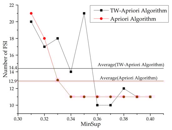 It can be seen from Figure 22 and Figure 23 that the number of FSI mined by Apriori algorithm decreases with the increase of the minsup threshold, while the mining results of the TW-Apriori algorithm do not show a monotonic decreasing trend, among them; when minsup is greater than 0.35, the number of FSI decreases rapidly; while minsup is greater than 0.37, the number of FSI increases by a small margin. At this time, the number of FSI mined by Apriori algorithm does not change with the growth of minsup. When the value of minsup is in the interval [0.032,0.036] and [0.037,0.039], the number of FSIs excavated has three peaks, and in these two intervals, the number of FSIs mined by the TW-Apriori algorithm is more than that mined by traditional algorithms, especially when minsup = 0.035. The TW-Apriori algorithm mined the largest number of FSIs. In addition, it can be seen from Figure 22 that the average value of the mining results of the TW-Apriori algorithm is higher than that of traditional algorithms. In this graph, it is proved that the status set sequential pattern mining method with time window can mine the status itemset in the local time window, which makes up for the defects of traditional sequential pattern mining methods and verifies the important value and significance of SSPMTW.