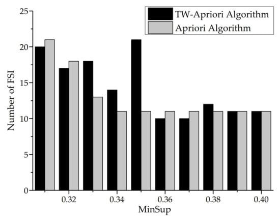 Next, this paper will use the TW-Apriori algorithm and Apriori algorithm to mine FSI and make a comparative analysis (minwin = 5000, mintcr = 0.1). The specific figures are shown in Figure 22 and Figure 23.