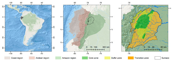 The Sumaco Biosphere Reserve (SBR) was declared by UNESCO in 2000. It is located 100 km southeast of Quito, in western Napo province covering various Andean and tropical ecosystems. The SBR’s LULC includes natural forest, disturbed forest, shrub vegetation, herbaceous vegetation, grasses, and crops. The core zone mainly includes non-intervention forests and protected areas. The buffer zone contains representative examples of the country’s tropical rainforest and the Amazon region. The transition zone has intensive agricultural land use, Figure 1.