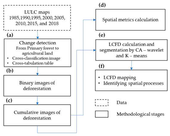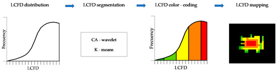 Figure 5 shows a procedure for segmentation and mapping of LCFD (Figure 2e,f). LCFD frequency distribution was used to define several LCFD categories or thresholds, which assist in characterizing the spatial processes of deforestation by coloring the LCFD into maps. To set LCFD thresholds we use two methods: CA-wavelet, and K-means. Both present reliable and satisfactory procedures to classify spatial structural patterns. CA-wavelet was used in other research for segmenting soil images using fractal features [47,48], and K-means was used similarly to discern urban sprawl patterns [49] and vessel complexity in patients with cerebral arteriovenous malformations [50], to mention some diverse application cases.