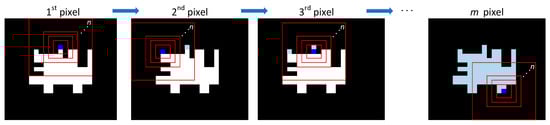 Scanning pixel procedure to calculate the local connected fractal dimension (LCFD). White pixels represent deforested patches, pixels in bold blue represent the currently scanned pixel, and the light blue pixels represent those scanned, from the first to the mth pixel. Red boxes indicate the scanning extent by n box sizes.