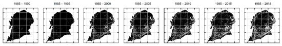 LULC map transitions identified as deforestation were converted into binary images using the reclassify function of the Raster package. These transitions were classified as 0 (white) indicating primary forest loss in SBR and background with 1 (black) (Figure 2b). In this step, we obtained seven binary images—one for each period. Then, these images were accumulated, obtaining six binary images of the deforestation process: from 1985– 1995, 1985–2000, 1985–2005, 1985–2010, 1985–2015, and 1985–2018 (Figure 2c). The extent of these images was 4027 × 4669 pixels.