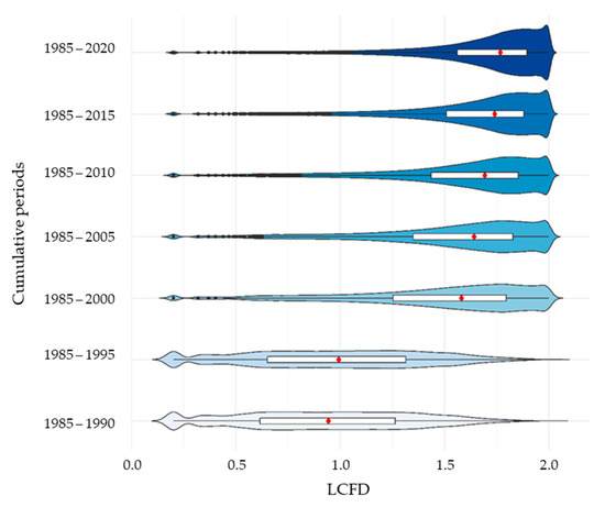 The temporal evolution of LCFD distribution for each of the seven images is shown in the violins of Figure 7. The most illuminating period is the evolution between 1995 and 2000, in which the LCFD median increased from 0.94 to 1.57. From 2000, the LCFD increased until 2018, when the median reached 1.78. The violins show that the frequency distribution was negatively skewed. This suggests an increase in the deforestation process’ complexity over time, regarding the initial primary forest of 1985. LCFD frequency distribution tends toward a skewed effect because of cumulative deforested patches throughout the periods. The skewed effect is to be expected in violin graphs, in which the deforested area increases over time. From 2000, LCFD distribution was skewed to the left with higher values of LCFD, while at the same time, the NP decreased, and the total deforested area increased (Table 2). This state of the deforestation process suggests a consolidation of forest loss with a high connectivity network with complex spatial features.