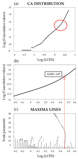 For LCFD segmentation with CA-wavelet (using a Mexican hat wavelet), the results are shown in Figure 8. In this figure, a singular point was identified in the CA distribution of the LCFD, corresponding to the slope-change point marked with a red circle in Figure 8a. Then, the WTMM method was applied in order to locate this anomaly in the CA distribution. The points where the maxima lines converge denote the locations of anomalies in the curvature, Figure 8c. The slope-change point was identified corresponding to the LCFD of 1.57 (Figure 8b). This singular point suggests a partitioning threshold to segment LCFD distribution in the SBR.