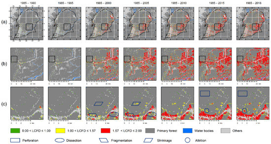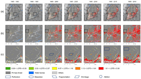Figure 9 shows the colored LCFD map results when applying the CA-wavelet threshold. In this, thresholds of 1.0 and 1.57 were used. The CA-wavelet method did not detect maxima lines around the value of 1.0. However, a threshold 1.0 was used in this segmentation because of its geometrical meaning: it separates unconnected points into one-dimensional clusters. This can be observed in the LCFD progress, from 1985 to 2018, in row B. Analyzing these zoomed-in squares reveals that the connections have progressed to a complex mosaic. The second zoomed-in squared in row C, indicates at the local scale the five spatial deforestation processes (dark blue outline boxes) and the relationships between them with the color map of the LCFD. Even though these processes are intricate in space at different scales, we selected samples for better understanding than the graphical interpretation of spatial deforestation processes presented in Figure 3.