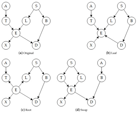 - Scanagatta, M.; Corani, G.; Zaffalon, M. Improved local search in Bayesian networks structure learning. In Proceedings of the 3rd International Workshop on Advanced Methodologies for Bayesian Networks, Kyoto, Japan, 20–22 September 2017; pp. 45–56. [Google Scholar]