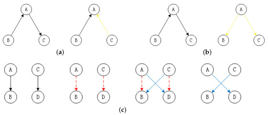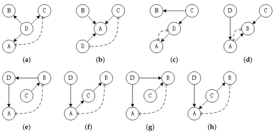 Figure 1d shows the influence of the Swap operator. It is different from the first two operators because the Swap operator may break acyclic constraint. Fortunately, the cycle can be eliminated by addressing the node which generates the cycle through Leaf, according to Corollary 1. All meaningless and illegal swap operations are shown in Figure 2, which constructs the foundation of the blacklist of the first step and the legitimacy test of the third step. In detail, Figure 2a,b are meaningless swaps because the exchanged nodes share the same child node or parent node; Figure 2c,d are illegal swaps, which leads to the illogical case that the parent node and the child node are the same; Figure 2e,f represent a prohibited condition that generates bidirectional edges; Figure 2g,h show a banned situation that generates existing edges. Then the complexity discussion of the Swap operator is provided: