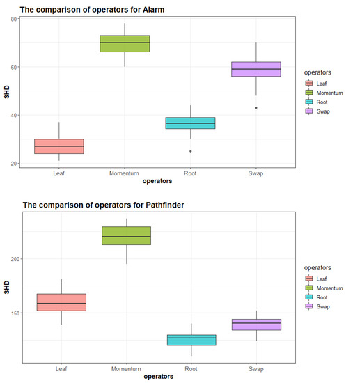 Intuitively, Momentum was dominant in both less complex and complex networks. In detail, the median SHD metric based on Momentum was about 17.9% and 39.7% higher than that of the suboptimal operator, and about 71.9% and 155.5% higher than that the most inefficient operator for two benchmarks, respectively. Moreover, for the Alarm network, some extreme values existed in the Swap and Root results, whereas Momentum’s results were very compact. Overall, Momentum could steadily affect the structure in a potent way.