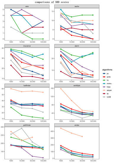 To qualitatively analyze which algorithm could learn a DAG closer to the ground-truth structure, we compared ILSM and algorithms mentioned in Section 4.3. Figure 5 and Figure 6 displayed the BSF and SHD metric of ILSM with reference to the scores produced by the other seven algorithms, respectively. Each of the 16 graphs corresponded to a case study and a metric. Unlike the experiments in Section 4.4.1, which measured the effect of the operators, a lower SHD score showed a better performance in this section. It was important to note that, in contrast to SHD, a higher BSF score demonstrated better performance. Some lines were incomplete or missing, which illustrated that the corresponding algorithm failed to learn a structure in the time limitation or memory limitation.