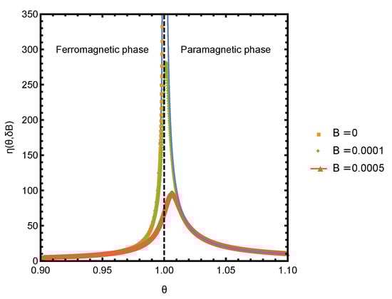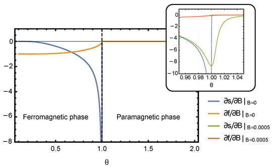 In the paramagnetic case , , both and are zero and, consequently, the efficiency appears to be undefined as it is a ratio of these derivatives. Nevertheless, in the paramagnetic regime, the derivatives of free energy and entropy can be made finite by either adding a small external magnetic field or by considering a finite size system. Here, we will consider the efficiency in the presence of constant magnetic field , which can be made arbitrarily small. In the presence of the external field and when , the equation of state (17) simplifies to , since the term is negligible. Thus, in this regime, and f can now be evaluated using Equations (13) and (14). From f, we compute and , then Taylor expands to the leading order in B to obtain