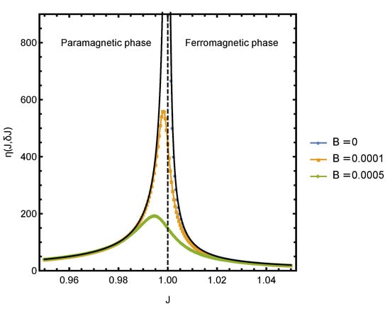 Thermodynamic efficiency as a function of J at several small values of B at . The critical point is at or, equivalently, at . For , is undefined at . The solid lines for and for are analytic expressions for in the vicinity of the criticality.