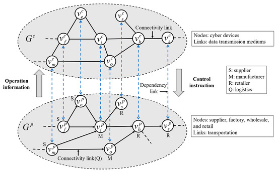 In cyber-physical supply networks, the cyber supply network and physical supply network mutually coordinate to attain dynamic closed-loop control. On the one hand, the firms in the physical supply network, such as suppliers and manufacturers, should provide flow information to devices in the cyber supply network for analysis. On the other hand, cyber supply network devices need to provide commands to firms in the physical supply network for control. Therefore, the two networks are assumed to display one-to-one interdependence. This coupling relation ensures that each node in the physical supply network has only one support node in the cyber supply network and vice versa [32]. Moreover, it should be noted that the topological structures of the two subsystems are not necessarily identical [33]. Therefore, let be a set of dependency links connecting nodes between network and network ; then, is defined as . The dependency link represents node depending on node , and vice versa.