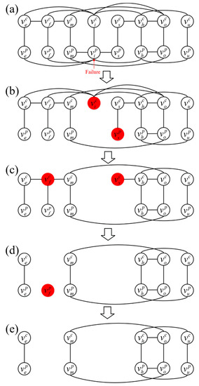 As shown in Figure 3, a cascading failure is triggered by the failure of node . First, is removed from the system along with its connectivity and dependency links. As a result, fails due to the load redistribution from . The failure of means that has no support and consequently fails. Second, fails due to the load redistribution from , and the failure of makes has no support and consequently fails. Third, fails from the lack of support due to the failure of node . Finally, is removed, and the cascading failure stops. The remaining functioning nodes are in network and in network .