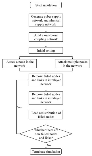 We extracted the supply network data of China’s electric vehicle supply network as the physical supply network, and the cyber supply network as the BA scale-free network [16,42]. The physical supply network was obtained from a secondary data source using Mergent Online, which lists global firms’ information, including suppliers, customers, and competitors. The number of physical supply network nodes was 317, including 269 suppliers, five manufacturers, and 43 customers and the directed edges were 497. The cyber network had 317 nodes, and the average degree was about 5. The physical supply network and cyber supply network were fully coupled, meaning all nodes in the physical supply network were one-to-one coupled to nodes in the cyber supply network. All simulations were repeated 20 times to minimize randomness, and the average values were used for further analysis. A flowchart of the numerical simulation is presented in Figure 4 to intuitively describe the iterative procedure of cascading failure in cyber-physical supply networks.