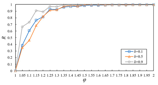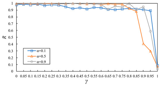 Next, we investigated the relationship between and with different values of in cyber-physical supply networks, and the results are presented in Figure 9. First, as changes from 0 to 1, the robustness of the whole network decreases. descends with the increase in . The reason is as follows: One firm’s failure can cause losses to its upstream and downstream firms, resulting in further failures of these firms. The successive failures of firms are caused by loads being less than the lower bound. A smaller could make the network more robust to cascading failure. The higher the value of the lower bound, the greater the cascading size [14].