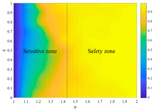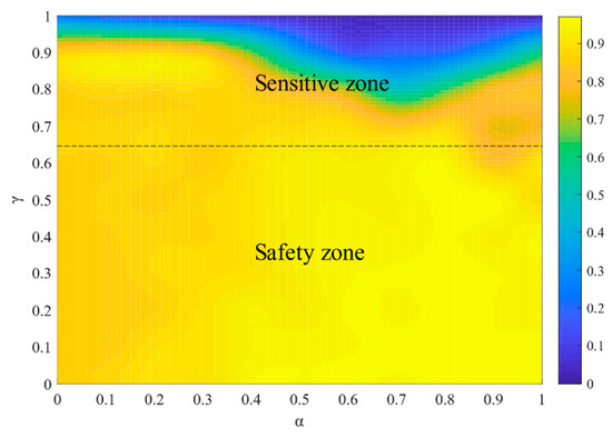 Figure 6 presents the heatmaps of within the parameter space . We observed that the critical thresholds and divide the heatmaps into two zones: safety zone and sensitive zone. In the safety zone, the value of is relatively large, and increases slightly with the increase in when . In the sensitive zone, the value of is relatively small, and increases significantly with the increase in when .