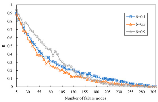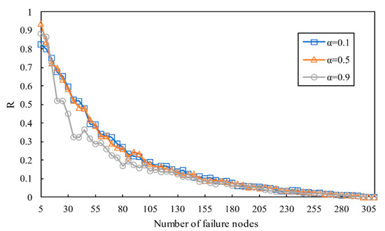 As shown in Figure 8, the influence of several node attacks on the robustness of networks is almost identical under different values of , but harms networks more seriously than and . With the increase in , the networks become more sensitive to several node attacks.