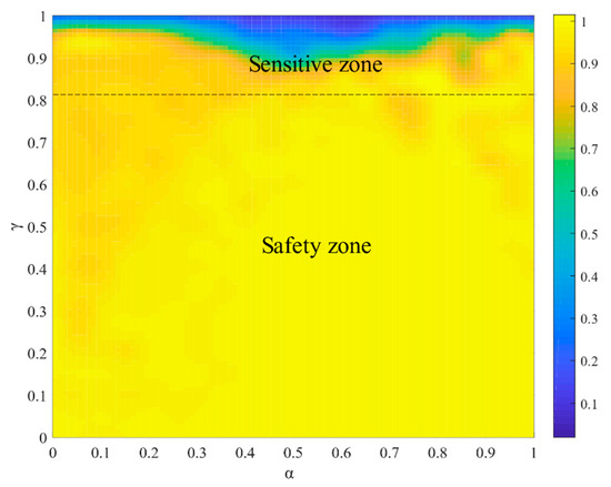 Figure 10 presents the heatmaps of within the parameter space . The critical thresholds, and , divide the heatmaps into two zones: the sensitive and safety zones. In the sensitive zone, the cascading robustness of the network varies with the setting of . When the capacity parameter space falls into the safety zone, the cascading robustness reaches the maximum value of 1, which means that cascading failure will not occur. The larger the safety zone, the lower the capacity extension costs to prevent cascading failures on the network [43].