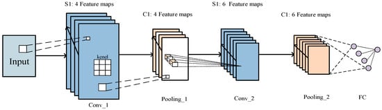 CNN is an efficient pattern-recognition method developed in recent years. It is widely used in GIS PD pattern recognition and classification due to its powerful automatic feature capture ability. Generally, a CNN is mainly composed of an input layer, a convolutional layer, a pooling layer, and a fully connected (FC) layer. The local connection and parameter sharing in the CNN reduce the number of parameters, greatly reduce the training complexity, and reduce overfitting. At the same time, its weight-sharing also makes the CNN tolerant of translations, while the down-sampling in the pooling layer further reduces the output parameters and makes the model tolerant to mild deformations, which improves the generalization ability of the model [10,11,12]. As shown in Figure 1, in each feature extraction layer, the feature map performs convolution calculation on multiple convolution kernels, and the feature extraction layers are connected by deviation calculation, activation function, and pooling operation. The operation of each feature extraction layer can be expressed as