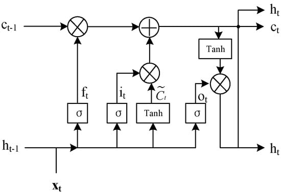 As a special form of RNN network, LSTM network has the ability to process time series. It can store previous data in its storage unit and is very effective in predicting time series data. Using the LSTM network can alleviate the gradient disappearance and explosion problems found in RNN. The LSTM network consists of four basic components: unit, input gate, output gate, and forget gate. This information is sent by the unit at random time intervals. The gate tracks the flow of input and output data from the unit. The forgetting gate determines how many cell states from the previous moment are retained in the current moment. The input gate determines the amount of current network’s input stored in the unit state. The output gate controls how much of the unit state is outputted to the current output value of the LSTM [13,14,15]. The basic configuration of the LSTM cell is shown in Figure 2.