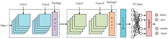 (3) The feasibility of the model is verified through experiments and compared with other traditional classification methods. The results show that the average recognition accuracy of the CNN-LSTM network proposed in this article reached 98%, which is better than the accuracy of other traditional methods [7,8,9].