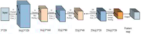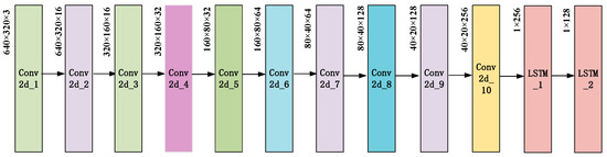 As shown in Figure 5, the CNN in the CNN-LSTM hybrid network uses 2D convolution, the shape of the convolution kernel is set to 3 × 3, and the step size is set to 2. The number of single-layer convolution kernels is 16, 32, 64, 128, and 256, and the number of double-layer convolution kernels is the same as the number of convolution kernels in the previous layer, with a total of 10 layers. The pooling layer has five layers, the window size of each layer is 2 × 2, and the step size is 2. The activation function is set to Relu, and the pooling operation of the last layer adopts global average pooling. The number of LSTM layers is set to 2, the number of units is 128 and 64, and the remaining parameters are system default values.