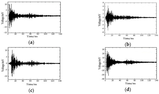 The simulation adopts the electromagnetic simulation software XFDTD. Import the simulation model established in Creo into XFDTD, as shown in Figure 2. The current pulse signals of four different partial discharge defects are used as the excitation source and imported into the simulation model, and the voltage probes of the 50 Ω load at different positions are set to obtain the required voltage signal. Four types of waveforms are obtained through simulation, namely, (a) metal tip, (b) air gap in insulator, (c) floating electrode, and (d) free metal particle defects, as shown in Figure 7 [21,22]. At the same time, it can be found that the voltage signals corresponding to different partial discharge defects are different, and the difference can be used to realize the identification of different partial discharge defect types.