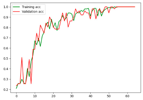 From the above simulation, 62 metal tip defect images, 63 air gap defects in the insulator, 64 floating electrode defects, and 63 free metal particles were obtained. A total of 252 images were used as datasets. Among them, 80% of the data samples are used for training, and 20% are used for testing, that is, 201 samples are trained, and 51 samples are verified. The model compilation process uses the cross-entropy loss function, the learning rate is set to 0.0001, the number of epochs is 65, and the batch_size is 32.