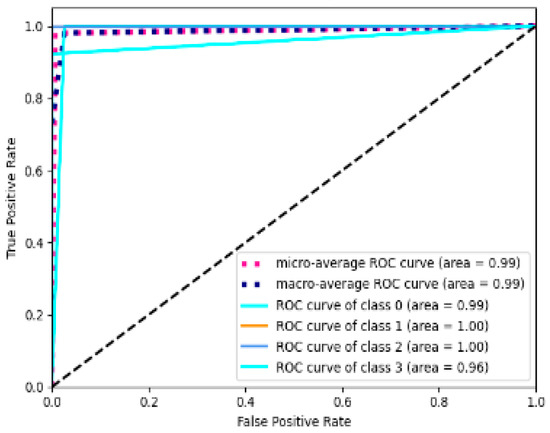 The receiver operating characteristic (ROC) curve can provide a view of the overall performance of the classifier. To verify the effect of the proposed model, the ROC curve is used to evaluate the model. The specific results are shown in Figure 9. It can be seen, in Figure 8, that the CNN-LSTM model proposed in this article has no false positives and no missing conditions. The four types of ROC curves are all pushed to the upper left corner, and the area under the curve (AUC) is close to 1. The closer the area is to 1, the better the classification effect. This proves that the CNN-LSTM model proposed in this paper has a good classification performance. As shown in the table below, we performed five times of ten-fold cross-validation to divide the data set into ten parts, and take turns using nine parts as training data and one part as the test data for testing. Through each test, the corresponding correct rate is obtained, and ten such tests were carried out. Finally, the average of the correct rates of these ten results is used as an estimate of the accuracy of the algorithm.