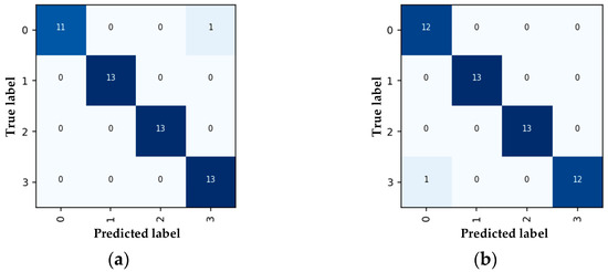 To visually display the classification effects of the model, a confusion matrix is used to visualize the classification results of the model. The proposed CNN-LSTM model is trained many times, and a confusion matrix appears at the end of each training. Among all the results, Figure 10a,b appears most frequently. Each column of the confusion matrix represents the predicted value, and each row represents the true category. In the confusion matrix (a), there are 12 prediction samples whose true category is type 0, one of which is incorrectly predicted as type 3, and all the remaining samples are predicted correctly. In the confusion matrix (b), there are 13 prediction samples whose true category is type 3, one of which is incorrectly predicted as type 0, and all the remaining samples are predicted correctly. It can be seen that the proposed CNN-LSTM model easily confuses type 0 (metal tip defects) and type 3 (free metal particles defects). However, the model’s recognition accuracy rate for type 0 and type 3 of PD defects still reached 91.6%. Therefore, the four types of PD signals are effectively separated and concentrated in a specific area. The model effectively learns features and realizes data classification.